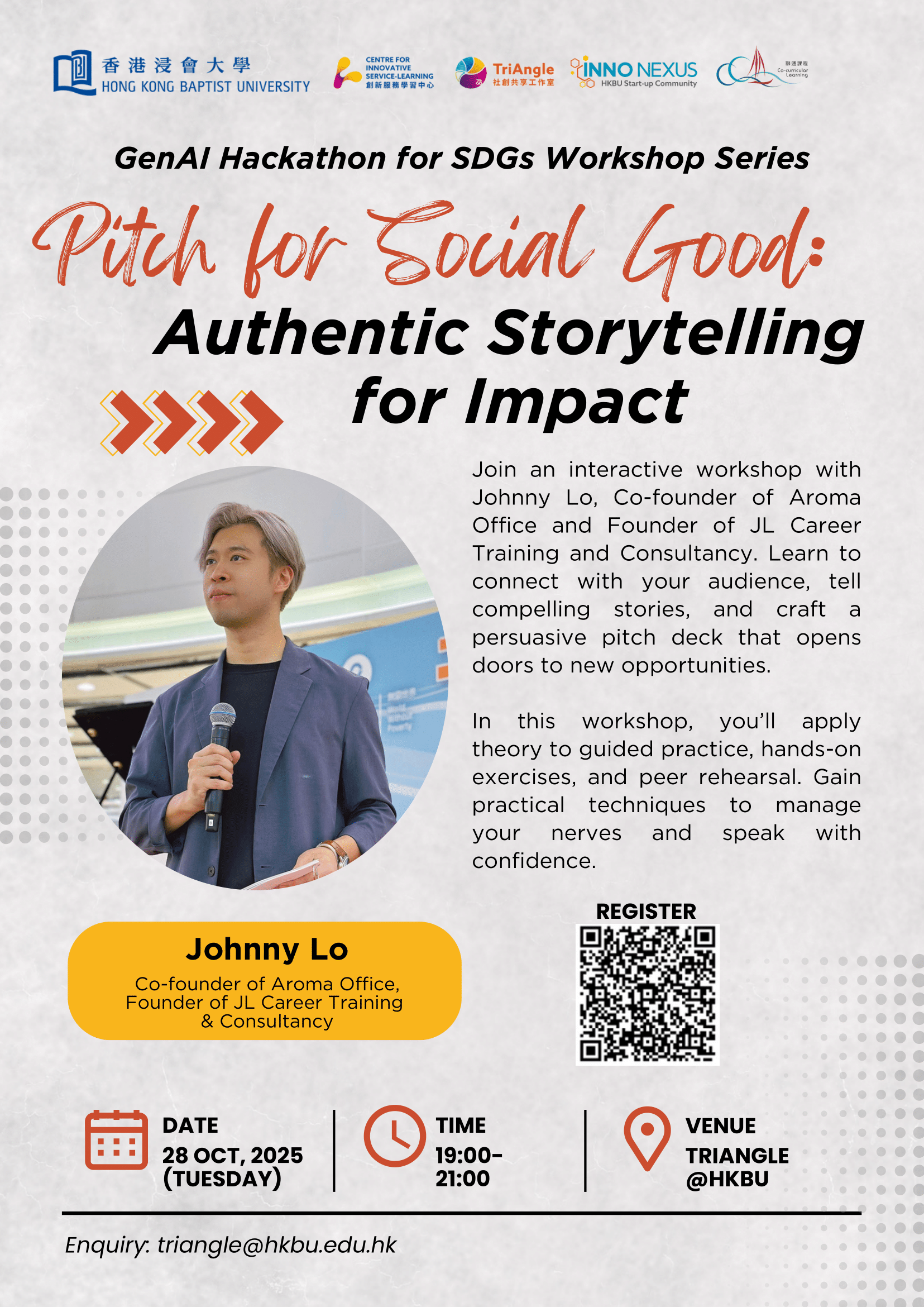Join an interactive workshop with Johnny Lo, Co-founder of Aroma Office and Founder of JL Career Training and Consultancy. Learn to connect with your audience, tell compelling stories, and craft a persuasive pitch deck that opens doors to new opportunities.