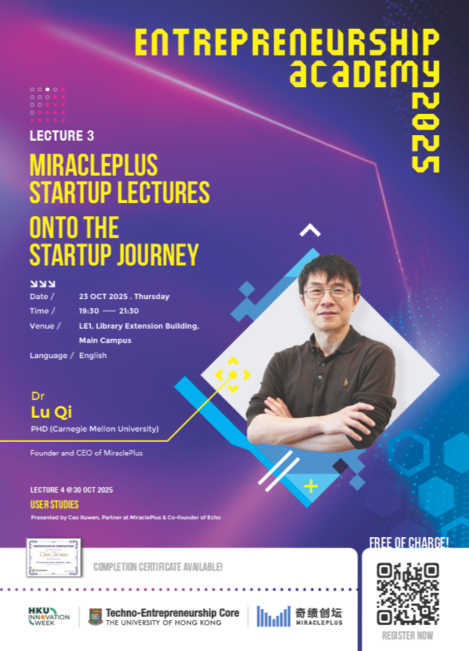 In this lecture, we are honoured to have Dr. Qi LU, Founder and CEO of MiraclePlus, as our Entrepreneurship Academy opening guest. This lecture will analyse the three main reasons why young people consider entrepreneurship. It will explain methodologies and share vivid case studies on finding startup opportunities and ideas, providing guidance and inspiration for those looking to start their own businesses.